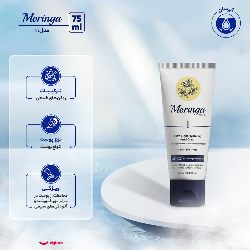 کرم دست فوق سبک و آبرسان مورینگا اِمو مدل 1 انواع پوست تیوبی 75 میلیلیتر
